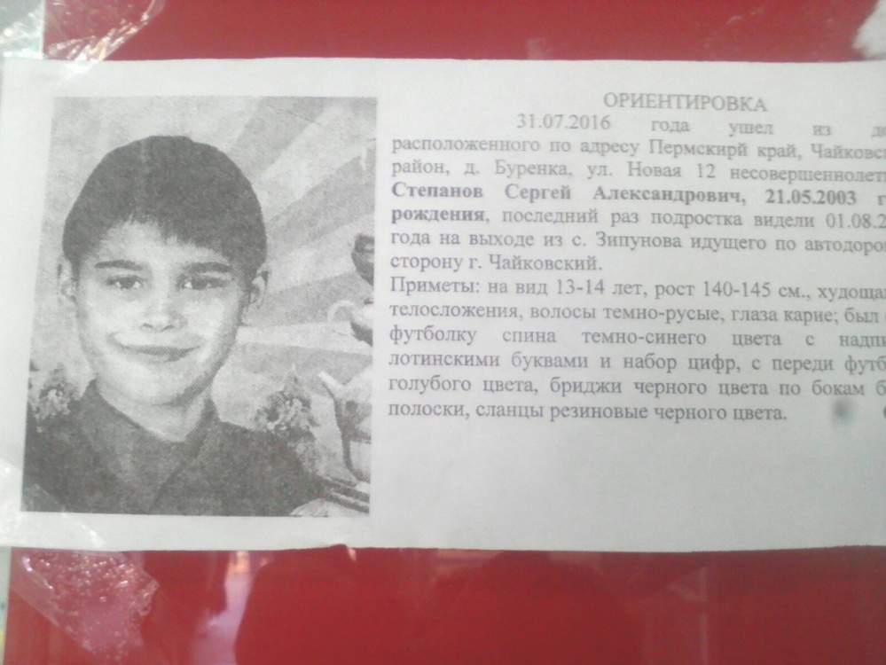 31 июля из дома в деревне Бурёнка ушёл 13-летний мальчик, не сообщив родителям о том, куда собирается идти. С заявлением о пропаже ребёнка родители обратились в полицию только под вечер следующего дня. 1 и 2 августа сотрудники чайковской полиции разыскивали подростка. Местонахождение беглеца удалось установить. Он находился на детской площадке, расположенной в районе из домов в микрорайоне «Уральский».