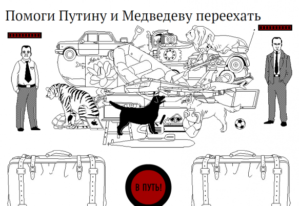 Как известно после инаугурации президента Дмитрий Медведев и Владимир Путин должны будут переехать на новые рабочие места, — пишет РИА, — Помоги им собрать свои вещи в чемоданы».