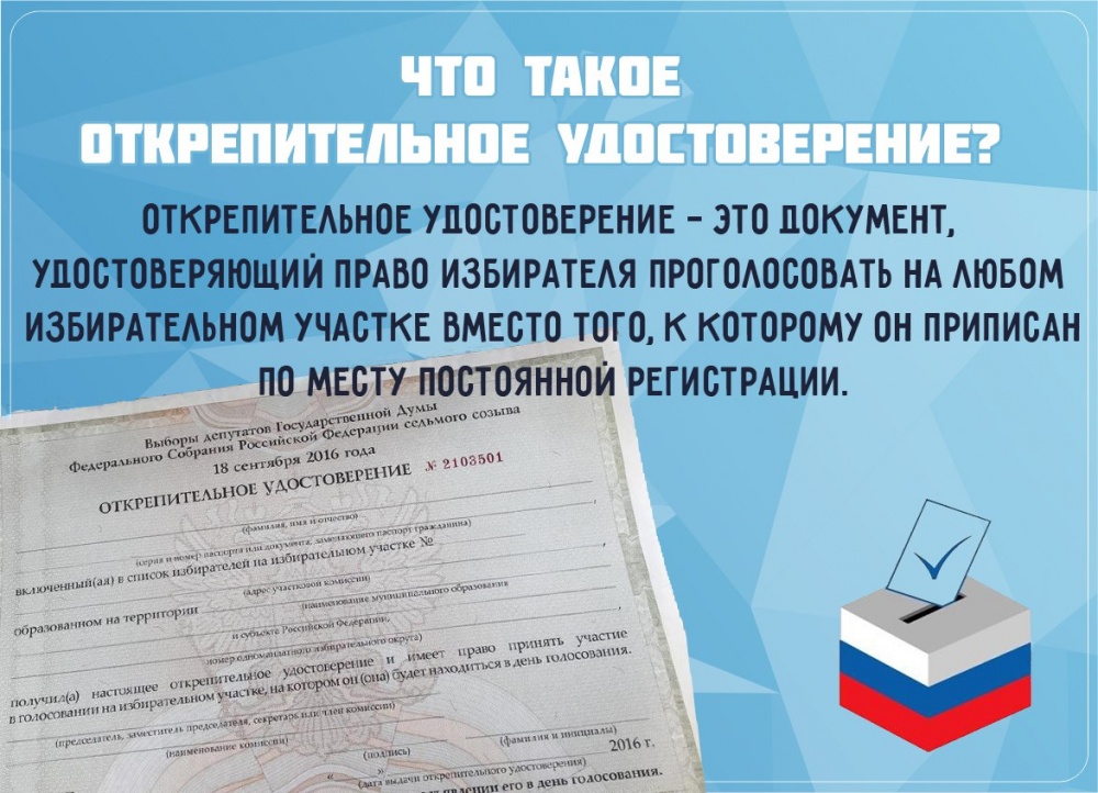 Если в Единый день голосования 18 сентября 2016 года вы по каким-либо причинам не сможет проголосовать на территории своего участка, вы можете сделать это на любом другом избирательном участке, воспользовавшись открепительным удостоверением.