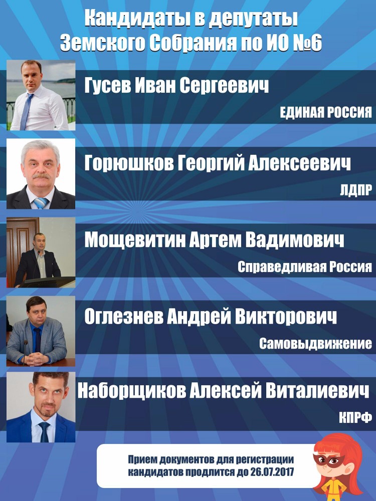 Всего документы на выдвижение представили пять кандидатов: Гусев Иван Сергеевич («Единая Россия»), Горюшков Георгий Алексеевич («ЛДПР»), Мощевитин Артем Вадимович («Справедливая Россия»), Оглезнев Андрей Викторович (самовыдвижение), Наборщиков Алексей Виталиевич («КПРФ»). Подробную информацию о кандидатах можно узнать в группе «Голос молодёжи | Чайковский».