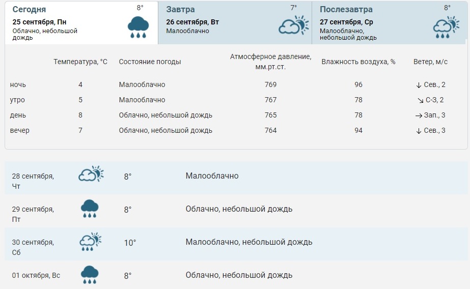 С 25 по 29 сентября в регионе установится пасмурная и дождливая погода. Температура воздуха будет держаться на отметке +5... +7 градусов днём.