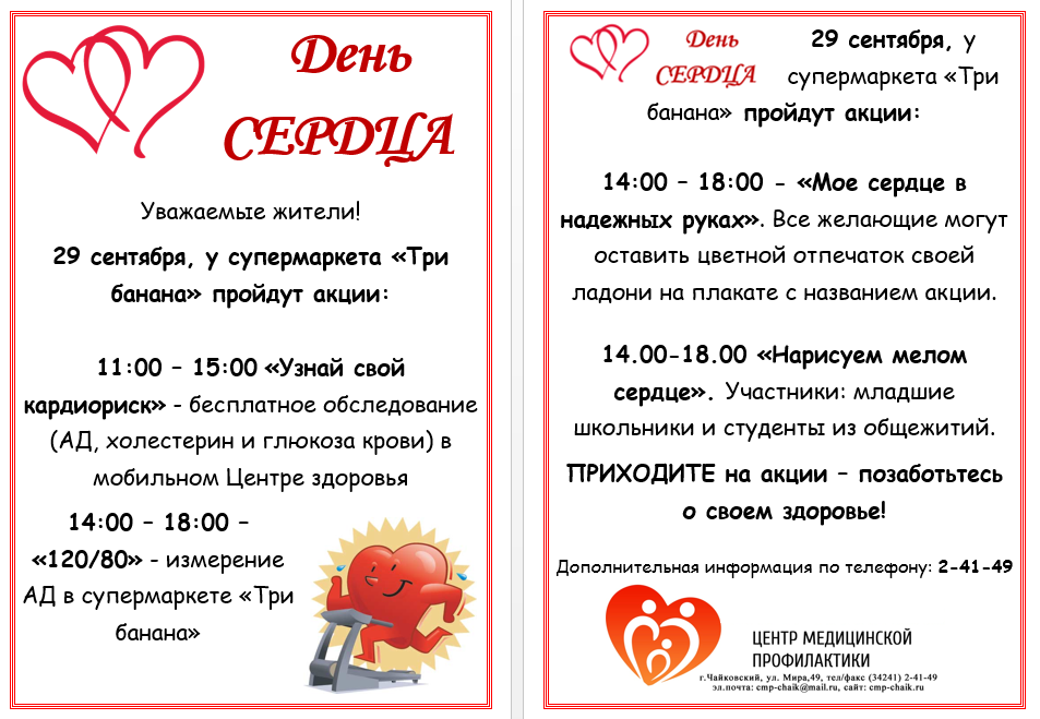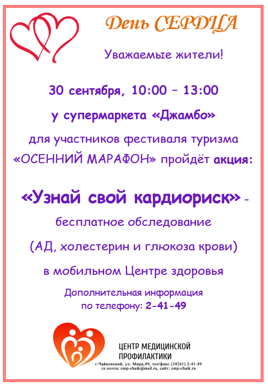 В Чайковском также пройдут акции посвящённые Дню сердца. 29 сентября у супермаркета «Три банан» и 30 сентября для участников фестиваля туризма «Осенний марафон» у супермаркета «Джамбо». Справки по телефону: 2-41-49.