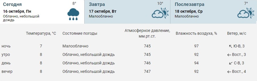 Температура воздуха днём 16 и 17 октября будет +8... +10 градусов. Ночью она опустится до +4... +5. Со среды начнётся стабильное похолодание. 18 и 19 октября днём ожидается +7, в среду ночью - +4, а в четверг ночью температура опустится до +2. Со среды по пятницу ожидаются дожди. Днём 20 октября воздух в городе прогреется до +6, а ночью перейдёт нулевую отметку.