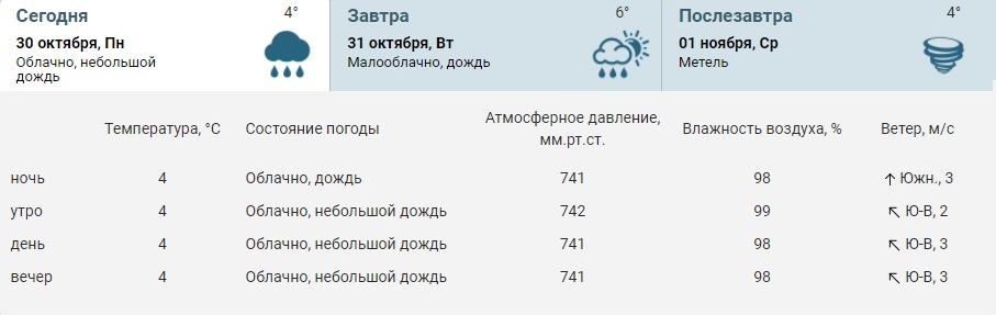 Краевое МЧС предупреждает о неблагоприятных погодных условиях в Пермском крае 30 октября. Сегодня ожидается облачная погода с прояснениями, днём небольшой, местами умеренный дождь, температура воздуха составит 0...+5°. Местами ожидаются слабые гололёдные явления, утром в отдельных районах на дорогах гололедица и туман. Порывы ветра могут достигать 9 м/с.