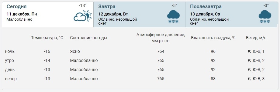 Днём в понедельник, 11 декабря, будет -11…-13 градусов, осадков не ожидается.