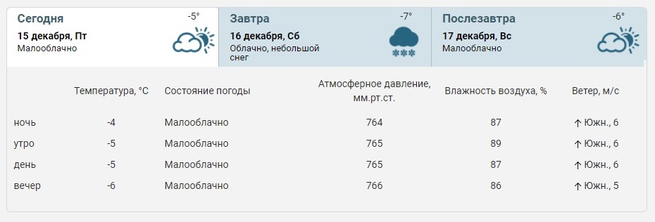 В выходные в регион придёт антициклон с Западной Сибири. В южной части края будет умеренно морозная погода с температурой до –10…–18. Вероятны прояснения. На севере края — на 3–5 градусов теплее и небольшой снег. В Чайковском в субботу, 16 декабря, синоптики обещают переменную облачность без осадков. Днём температура составит –7. В воскресенье небо прояснится, также не исключено, что будет на пару градусов холоднее.