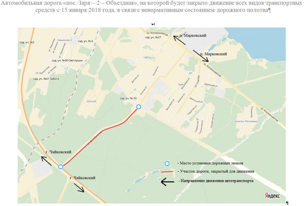 С 15 января 2018 года в связи с ненормативным состоянием дорожного покрытия, в целях безопасности дорожного движения закрывается автомобильная дорога «пос. Заря-2 – Объездная». Об этом сообщается на официальном сайте администрации Чайковского городского поселения.