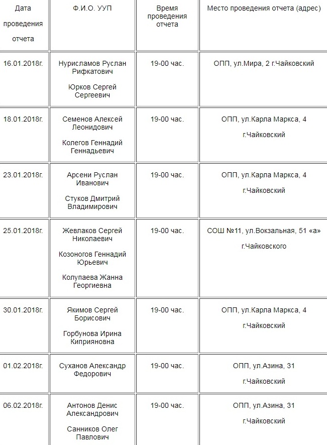 График отчётов перед населением участковых уполномоченных полиции и инспекторов по делам несовершеннолетних ОМВД России по Чайковскому району за 2017 год представлен ниже.