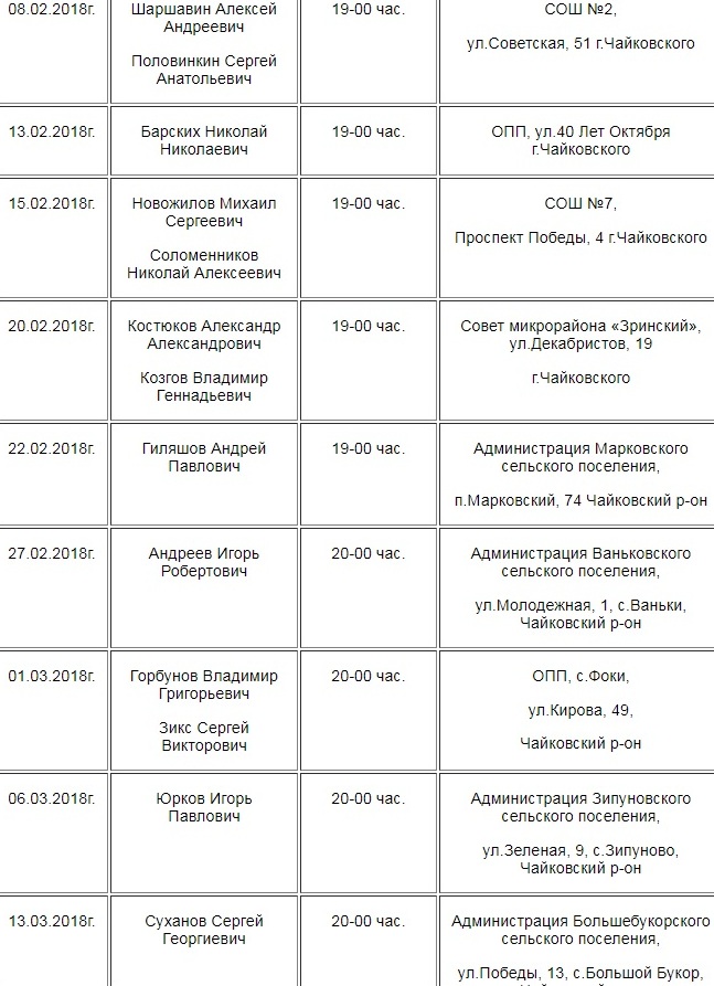 Внимание! В графике допущена неточность о месте и времени встречи на 25 января. Собрание пройдёт в 19.00 в клубе «Ровесник» (ул. Ленина 68). На собрании планируется присутствие: врио начальника ОУУП и ПДН майор полиции Варламова Ирина Сергеевна, врио заместителя начальника полиции (по ООП) капитан полиции Косачев Алексей Александрович, начальник отдела ГИБДД майор полиции Кочергин Степан Николаевич и представитель общественного совета при ОМВД России по Чайковскому району.