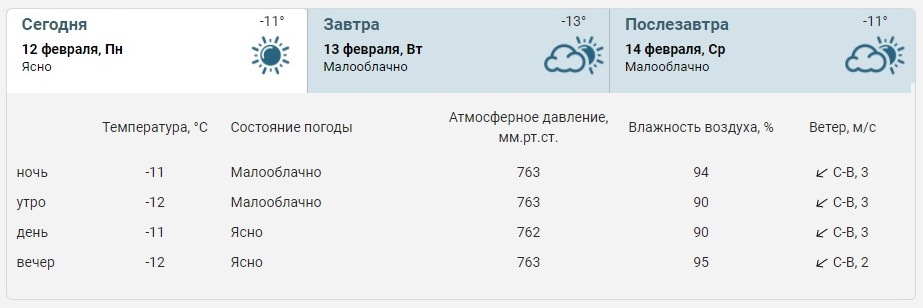 В понедельник 12 января ожидается малооблачная погода, температура днём составит до –11 градусов, ночью возможно похолодание. По данным метеорологов, постепенное потепление начнется со среды, 14 февраля. На смену солнечной погоде придут снегопады, которые продлятся до выходных. Температура воздуха в четверг, пятницу и субботу составит -7...-10 градусов.