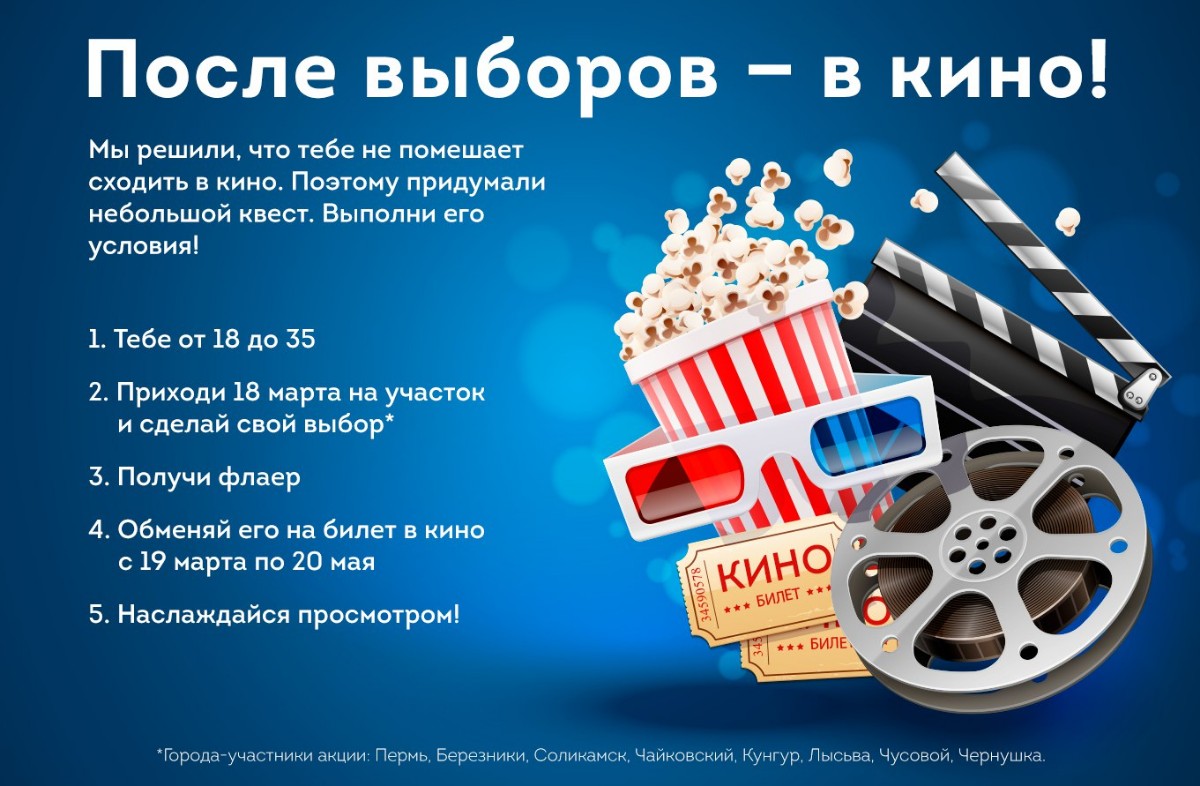 Жителям восьми городов Прикамья, в том числе и Чайковский, обещают билеты в кинотеатр за участие в президентских выборах.
