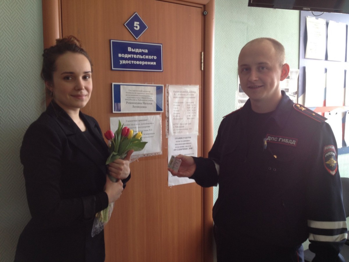 Так, накануне 8 марта, девушкам и женщинам, которые получали или обменивали водительские удостоверения, сотрудники регистрационно-экзаменационного отделения ГИБДД дарили весенние цветы и вручали поздравления от имени руководителя.