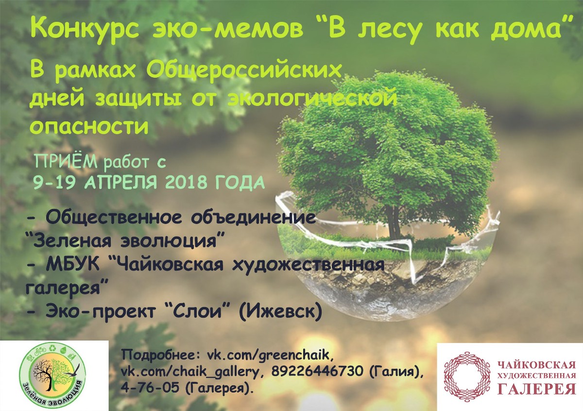 В рамках выставочного проекта «Слои» и Дней защиты от экологической опасности Чайковская художественная галерея совместно с общественным объединением «Зелёная эволюция» запускает конкурс эко-мемов «В лесу как дома».
