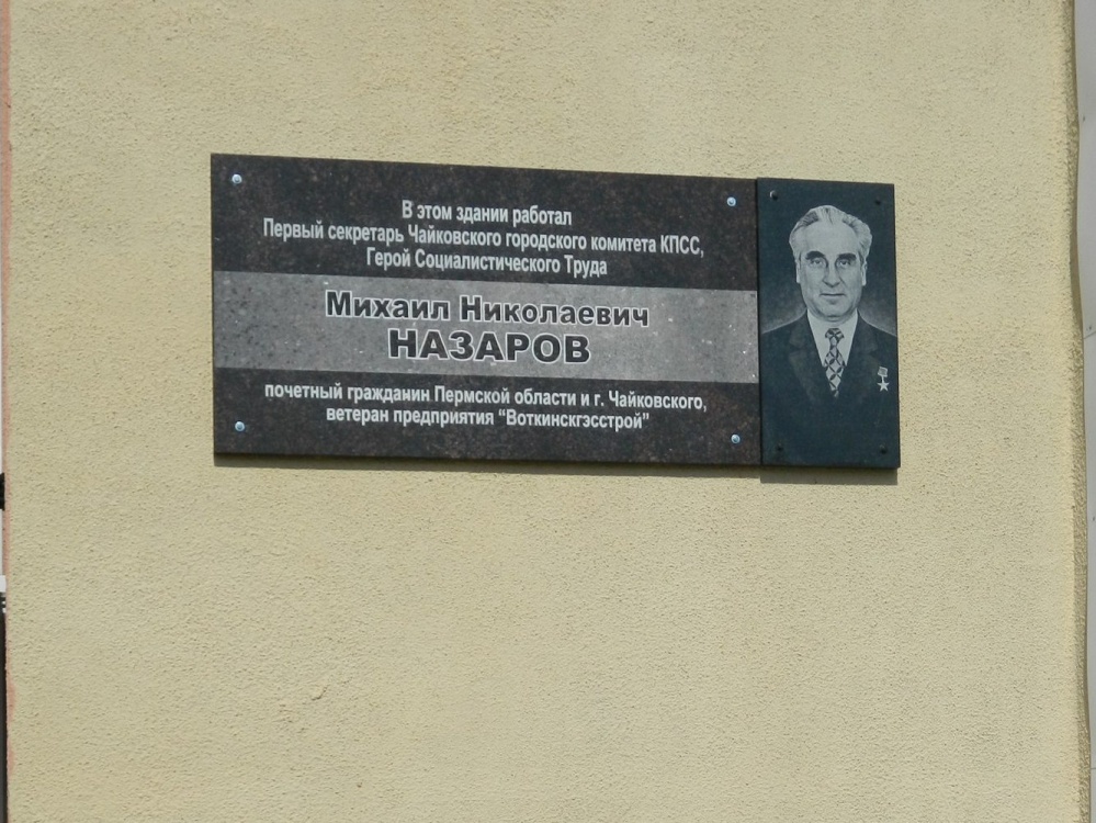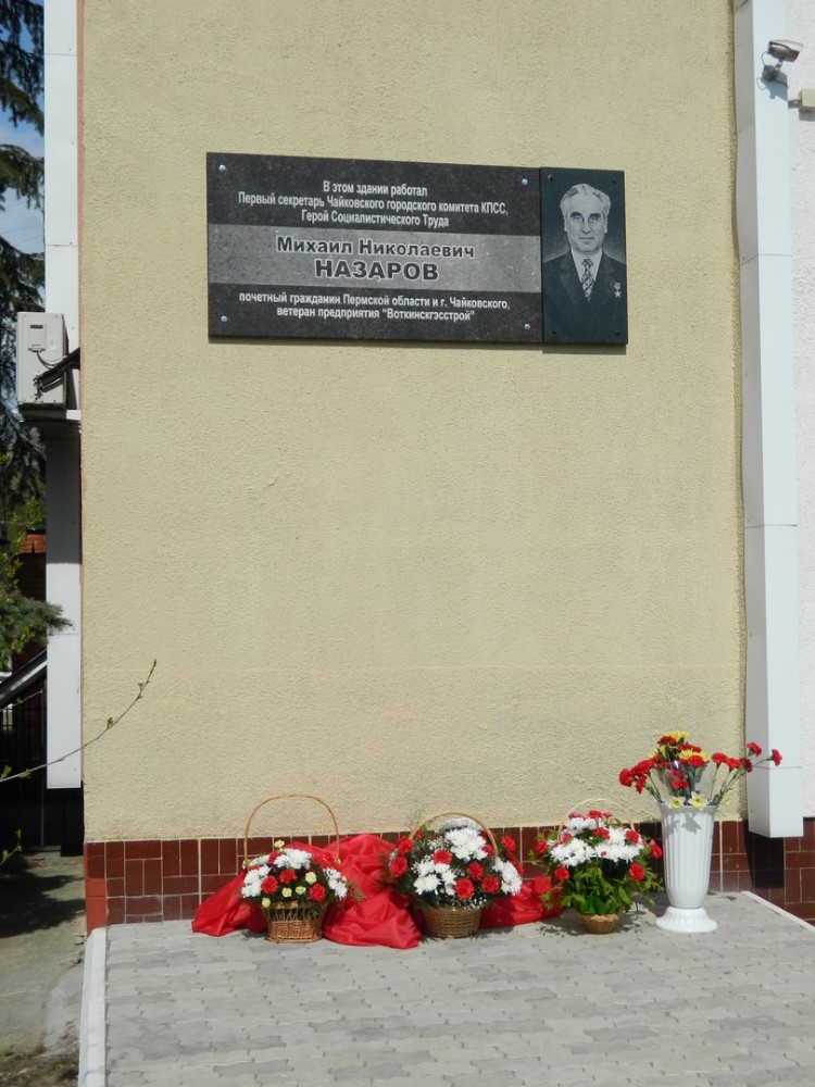 18 мая, на фасаде здания Чайковского городского суда – в прошлом Городского комитета партии – состоялось открытие мемориальной доски, посвящённой памяти Михаила Николаевича Назарова, первого секретаря Чайковского горкома КПСС, почётного гражданина Чайковского, одного из первостроителей города.