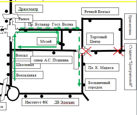 Схема движения автобусов по маршрутам №№ 2К\1, 2К\2, 15, 7 на время ограничения движения по улицам Карла Маркса и Кабалевского с 8 по 10 июня (включительно) представлена ниже.