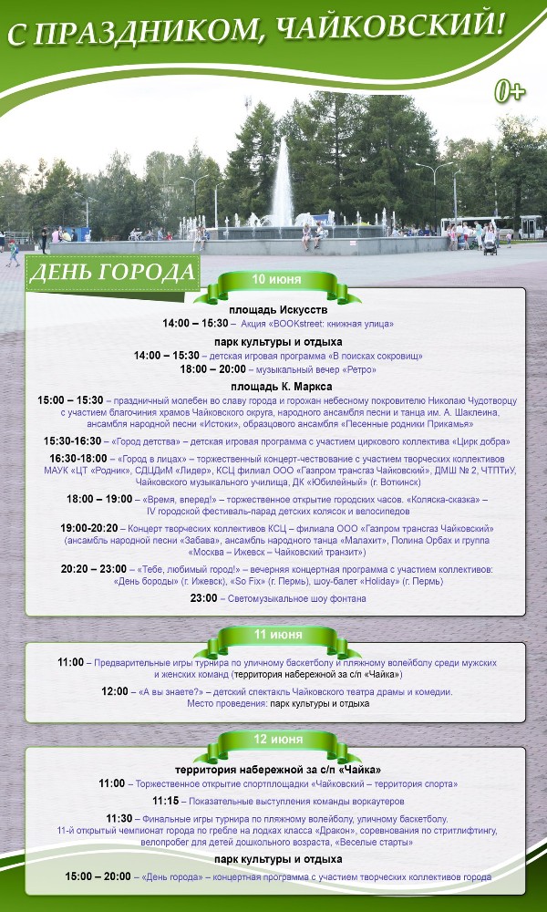 Ещё в конце мая МАУК «Центр творчества «Родник» опубликовал программу мероприятий, посвящённых празднованию Дня города. Из афиши было видно, что в этом году праздничная программа «растянется» на три дня. Согласно афише, жителям и гостям города предстоит увидеть выступление кавер-групп, турнир по стритлифтингу, концертную программу, а в конце первого праздничного дня, 10 июня, чайковцев должен был порадовать фейерверк.