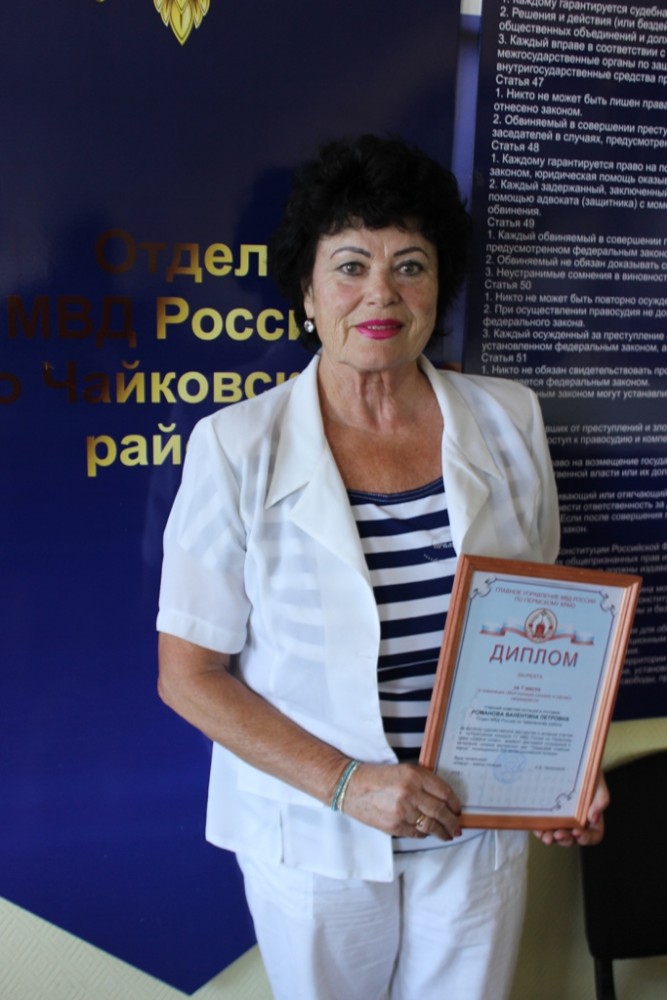 Так, обладателем призового места в конкурсе «Доброе слово» стала представитель общественного совета при ОМВД России по Чайковскому району Валентина Романова. Победителю был вручён диплом.