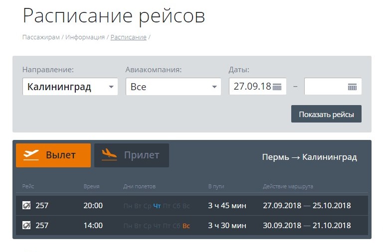В калининградском аэропорту «Храброво» рассказали, что прямые регулярные перелёты будет выполнять компания «ЮВТ Аэро». Время в пути – 3,5 часа. По четвергам самолёты будут вылетать из Перми в 20.00, в Калининград прилетят в 20.45. Обратный рейс из «Храброво» запланирован на 21.45, прибытие в «Большое Савино» – в 4.05. По воскресеньям вылет из Перми – в 14.00, посадка в Калининграде - в 14.30, вылет из Калининграда – в 15.30, прибытие в Пермь – в 21.50. В расписании указано местное время для обоих городов.