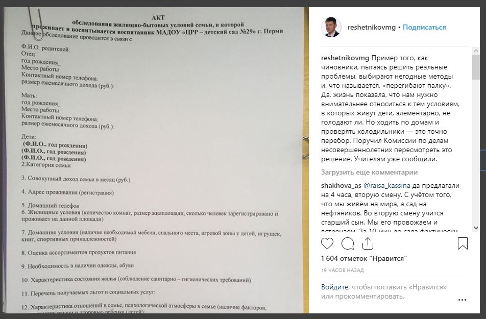 Накануне губернатор Пермского края Максим Решетников опубликовал на своей страничке в соцсети Instagram фотографию «Акта обследования жилищно-бытовых условий семьи, в которой проживает и воспитывается воспитанник МАДОУ «ЦРР — Детский сад №29» г. Перми» и отметил, что метод никуда не годится.