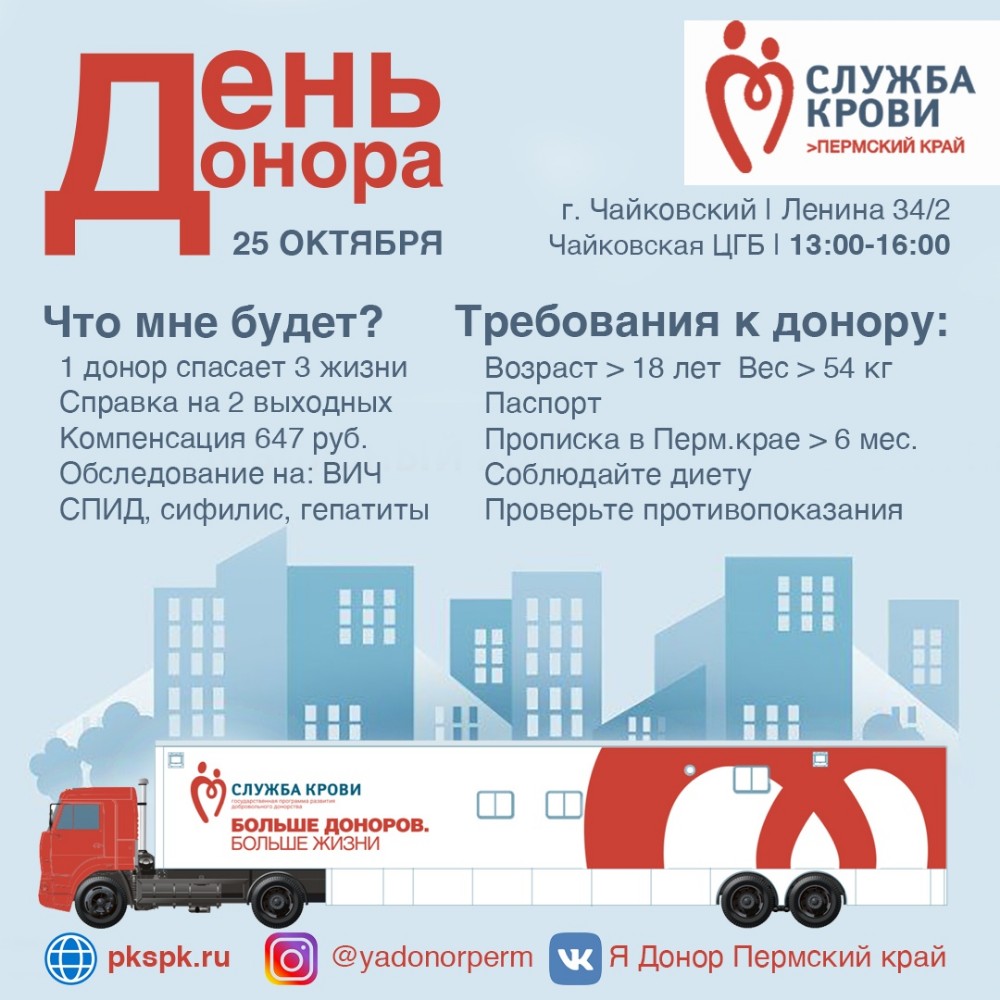 Приём доноров будет осуществляться в Чайковской центральной городской больнице (ул. Ленина, 34/2) с 13:00 до 16:00. Предварительная запись не требуется. Однако в краевой станции переливания крови отмечают, что при себе нужно иметь паспорт с регистрацией на территории Пермского края не менее шести месяцев.