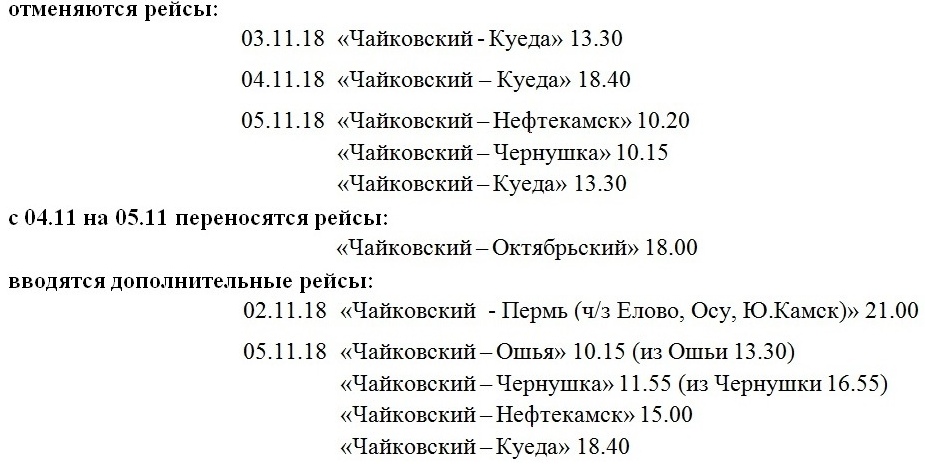 Как сообщили в МУП «Автовокзал», в связи с праздничными днями в расписании движения междугородних автобусов, отправляющихся с чайковского автовокзала, произошло несколько изменений.