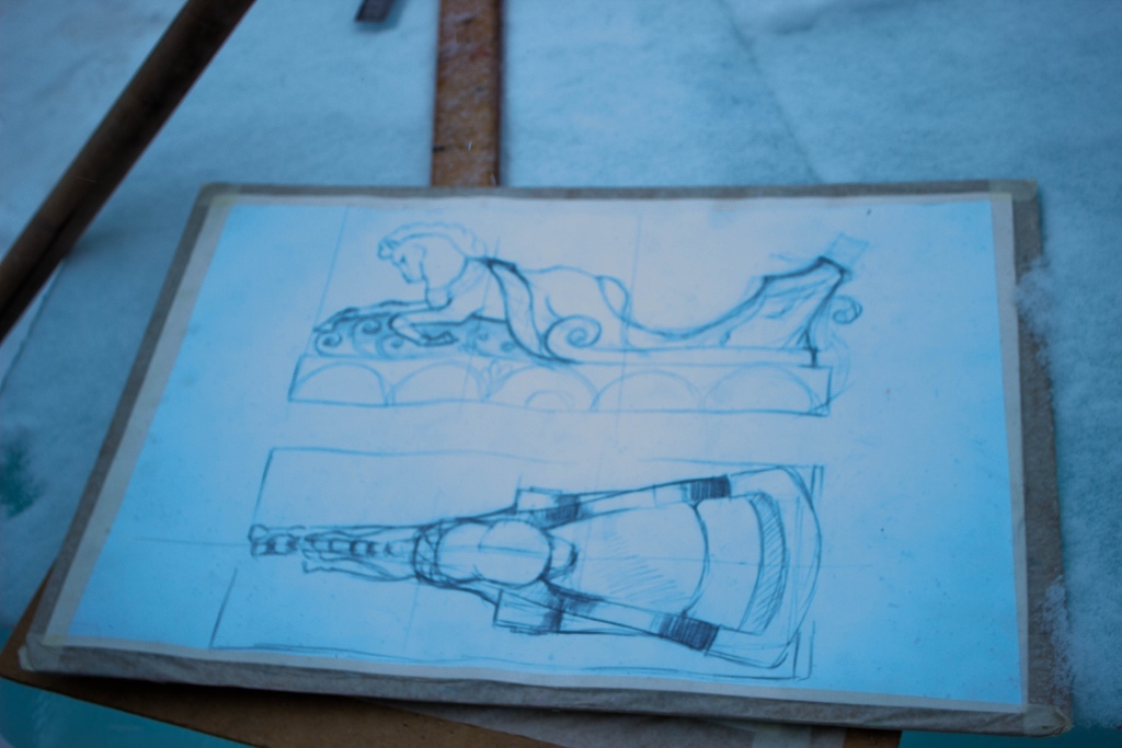 Из ледяных блоков мастера сотворят три фигуры. Под ёлочкой жителей и гостей города будут встречать ювелирно изготовленные величественные Дед Мороз и Снегурочка. Третьим новогодним уличным украшением, согласно подсмотренному эскизу, должна стать санная повозка с запряженной в неё лошадкой.