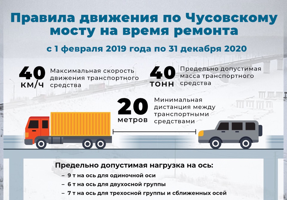 В целях обеспечения безопасности дорожного движения в связи со снижением несущей способности конструктивных элементов Чусовского моста в период с 1 февраля 2019 года по 31 декабря 2020 года включительно вводится временное ограничение движения транспортных средств по Чусовскому мосту, — сообщает Министерство транспорта Пермского края.