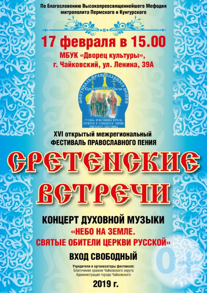 В воскресенье, 17 февраля, во Дворце культуры по благословению Высокопреосвященнейшего Митрополита Пермского и Соликамского Мефодия состоится XVI открытый межрегиональный фестиваль Православного пения «Сретенские встречи».