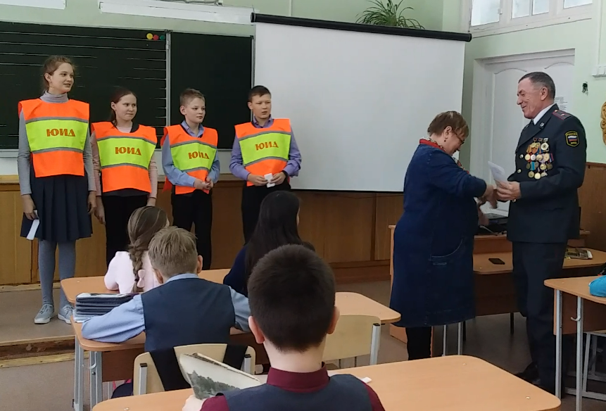 На протяжении встречи дети с большим вниманием слушали гостя, с интересом смотрели фотографии и фильм о Госавтоинспекции, а так же задавали интересующие их вопросы. В свою очередь, ЮИДовцы школы подготовили для ветерана ГАИ-ГИБДД стихи со словами благодарности за профессиональный вклад в общее дело по обеспечению безопасности дорожного движения.