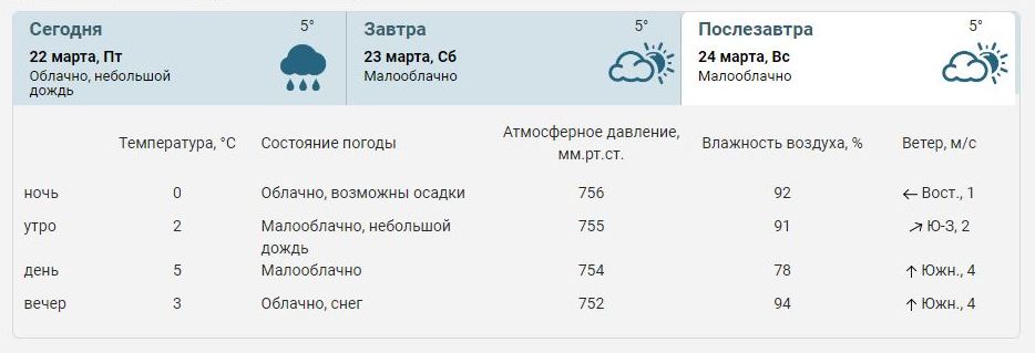 В субботу днём температура воздуха составит +4… +5 градусов. Ожидается облачная погода с прояснениями. В воскресенье, 24 марта, возможны небольшие снегопады и дождь. Столбик термометра не поднимется выше +4 градусов.