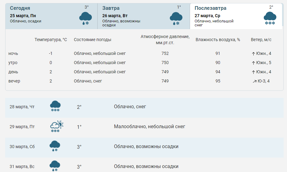 В среду, 27 марта, в первой половине дня в краевой столице и по югу края, в том числе и в Чайковском, вновь выпадет мокрый снег, тем не менее, по данным пермских синоптиков, в этот день ожидается потепление +3 °С... +5 °C.