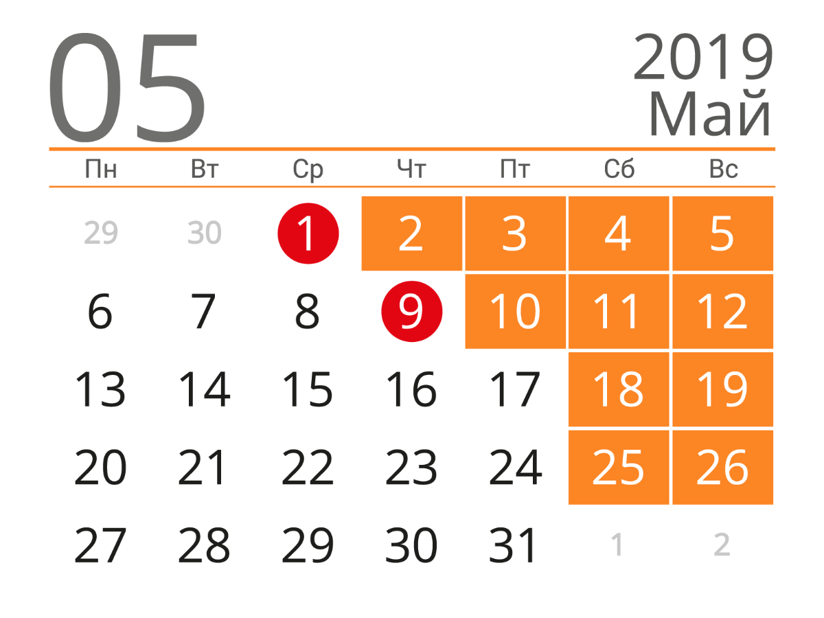 Сначала будем отдыхать пять дней в честь Дня весны и труда - с 1 по 5 мая. Соответственно, работать будем накануне только в понедельник и вторник, 29 и 30 апреля соответственно.