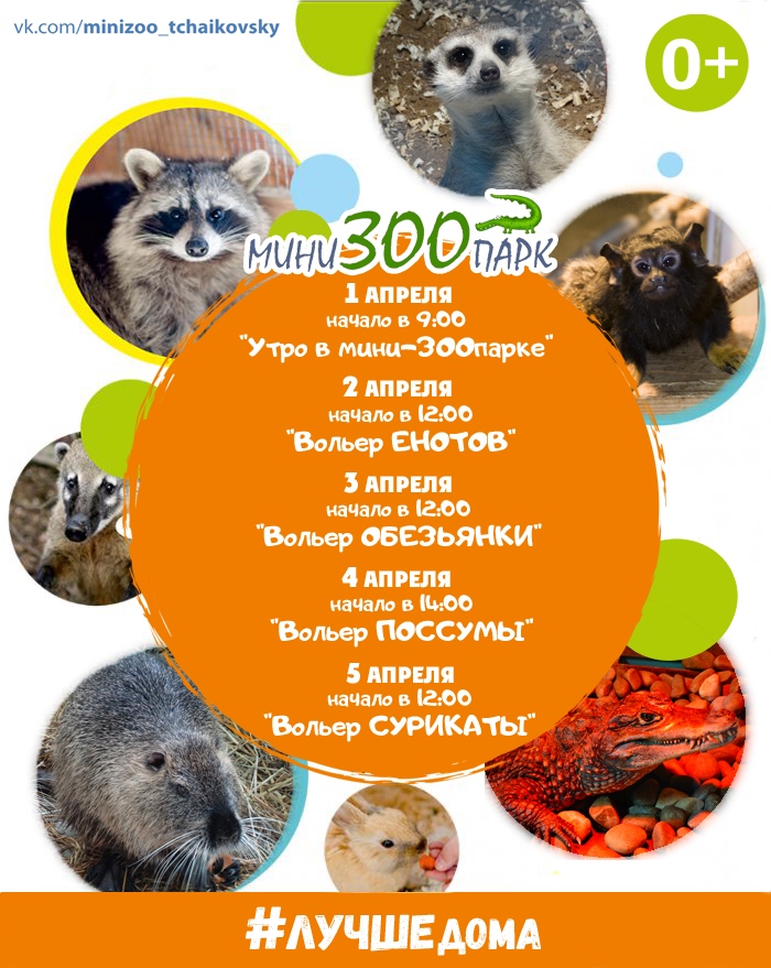 Чайковский мини-зоопарк также перенёс мероприятия в режим «онлайн». Прямые эфиры из зоопарка будут вестись в официальном сообществе в соцсети Вконтакте «Мини ЗООпарк | Чайковский» до 5 апреля включительно по следующему расписанию: