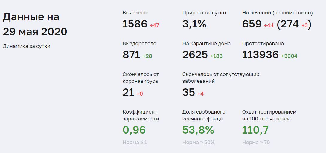 Также из новых инфицированных зафиксировано 3 летальных исхода. У пациентов 95, 82 и 80 лет посмертно был обнаружен COVID-19. Причины смерти - сопутствующие заболевания. Таким образом, в регионе в настоящее время зафиксирован 21 летальный исход пациентов от COVID-19. Ещё 35 случаев смерти инфицированных - не от COVID-19.