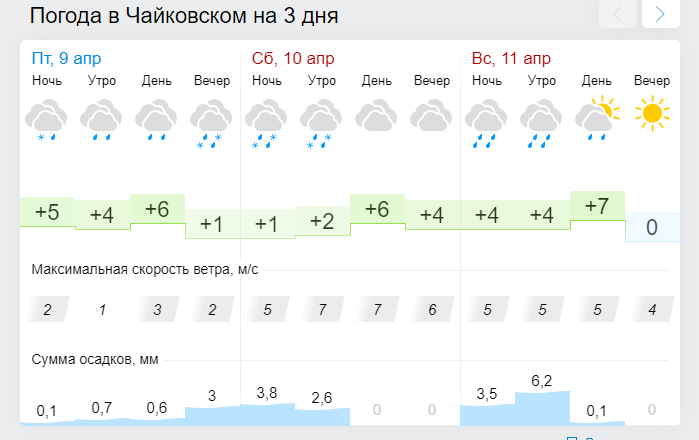 В воскресенье ночью в Пермском крае облачно, небольшой, местами умеренный дождь (по северу со снегом), в отдельных районах туман. Днём облачно, небольшой, местами умеренный дождь (по северу переменная облачность, без осадков). Температура воздуха ночью +2…+7° (по северу −3…+2°), днём +7…+12°. Ветер южный, юго-западный 2-7 м/с, днём местами порывы до 12 м/с.