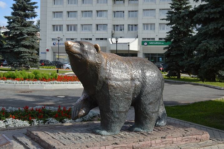 — На гербе Перми изображён медведь с золотым Евангелием на спине. Бронзовый медведь — почти в натуральную величину, но уже без Евангелия — украшает и одну из центральных улиц города, — так описывается скульптура «Легенда о пермском медведе», стоящая в Перми возле отеля «Урал» на перекрёстке Компроса и улицы Ленина. — Туристы и пермяки медведя любят и при удобном случае трут ему нос на удачу.