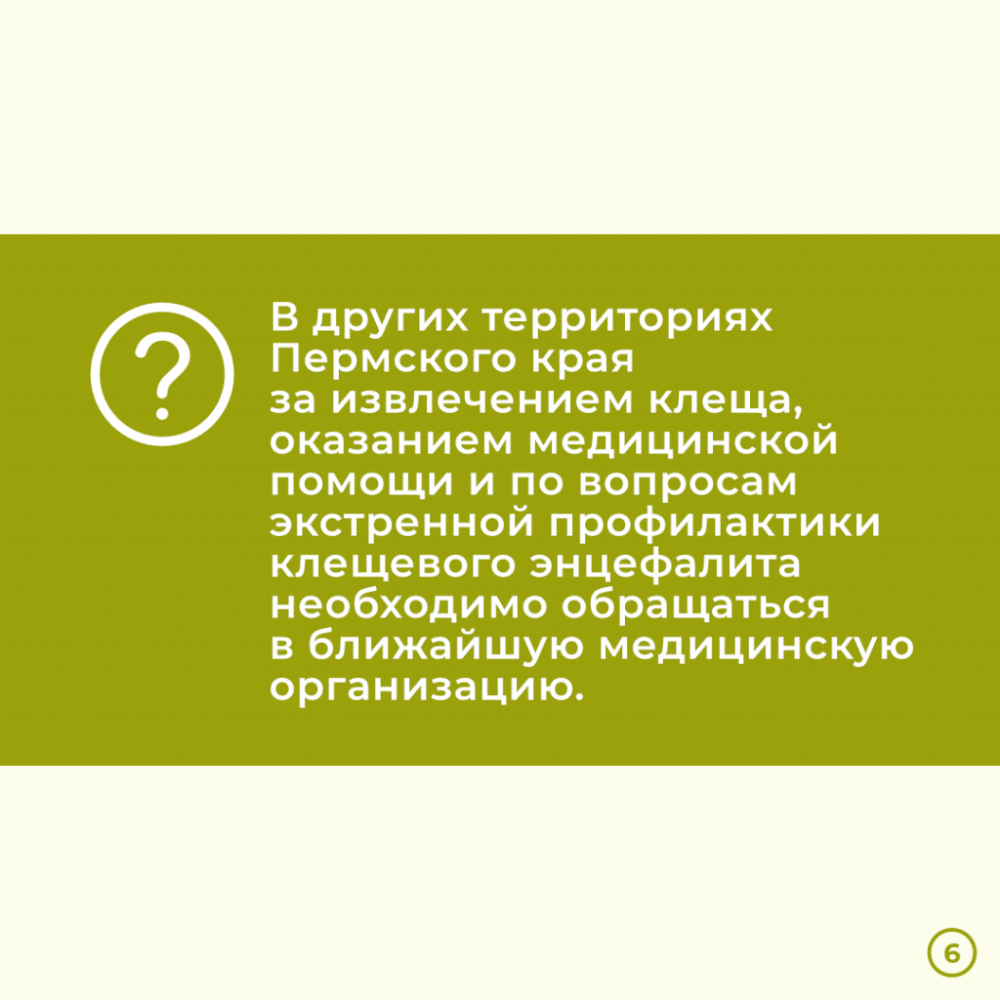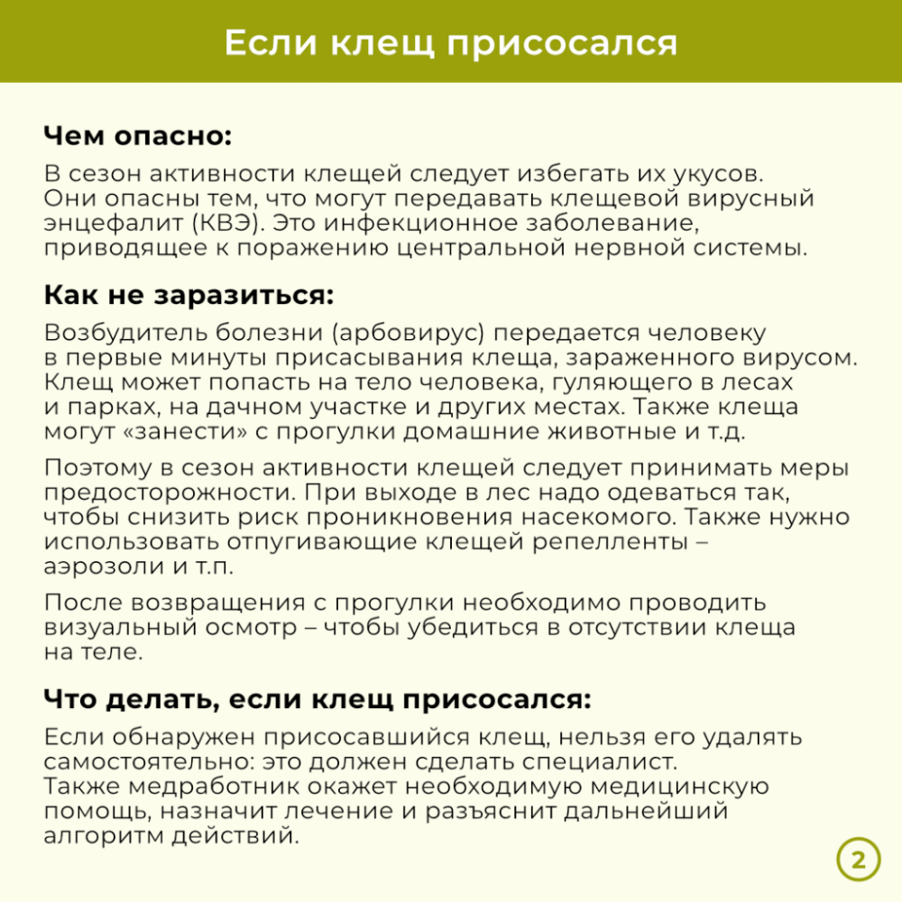 В региональном Минздраве подчёркивают: если обнаружен присосавшийся клещ, нельзя его удалять самостоятельно: это должен сделать специалист. Также медработник окажет необходимую помощь, назначит лечение и разъяснит дальнейший алгоритм действий.