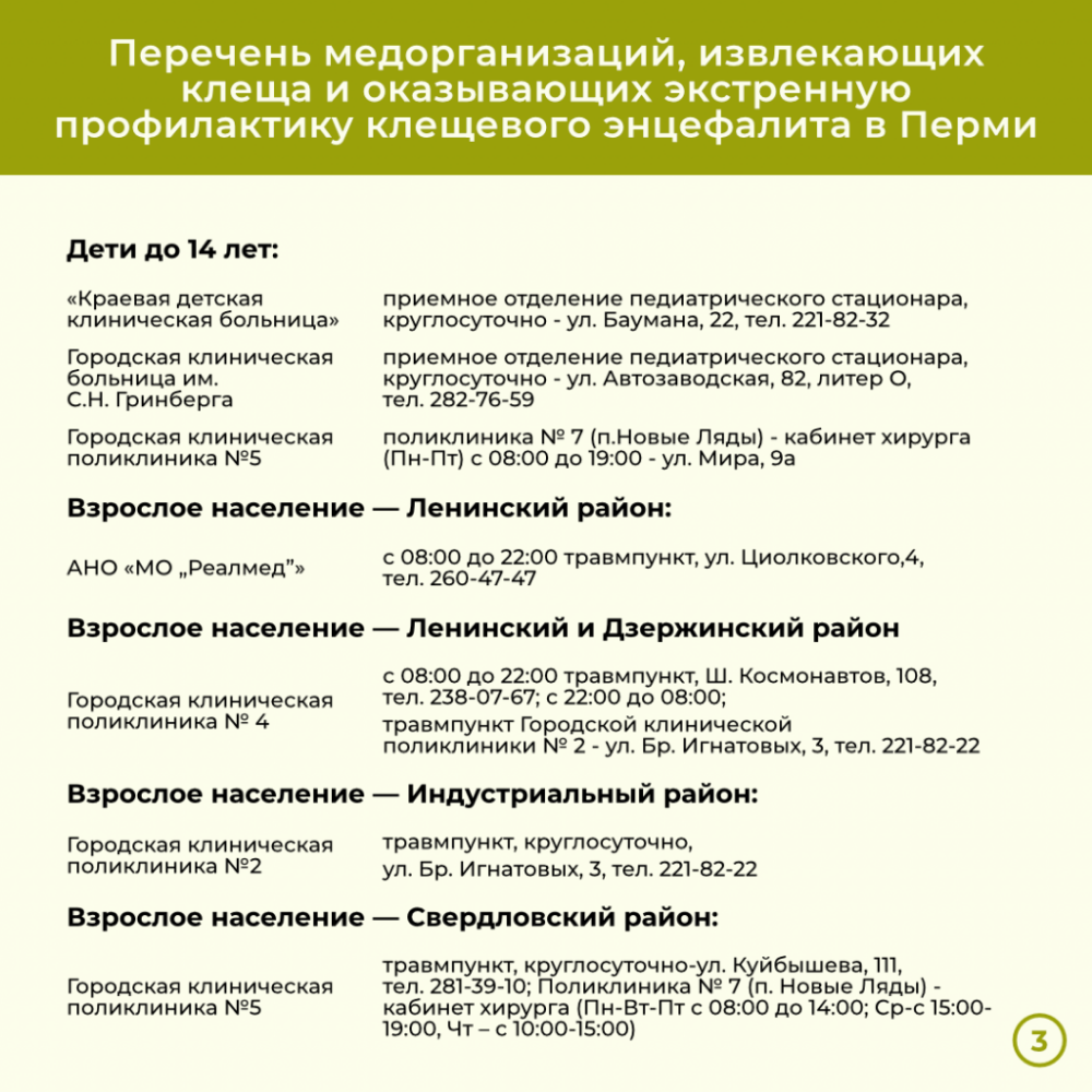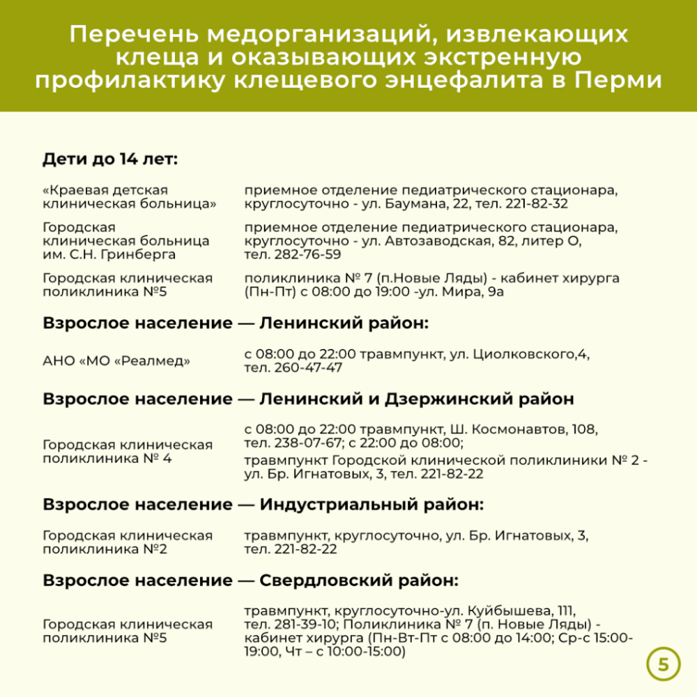 По данным Управления Роспотребнадзора по Пермскому краю, с начала эпидемического сезона в медицинские организации региона обратилось 9786 пострадавших от укусов клещами, из которых 2012 – дети. Из них за неделю зафиксировано 1706 случаев, в том числе 272 – у несовершеннолетних. По результатам лабораторных исследований иксодовым клещевым боррелиозом клещи были инфицированы в 2510 случаях (477 из них – за неделю), клещевым вирусным энцефалитом – в 104 (+ 20 за неделю), моноцитарным эрлихиозом человека – в 6 155 (+1 268), гранулоцитарным анаплазмозом – в 151 (+32).