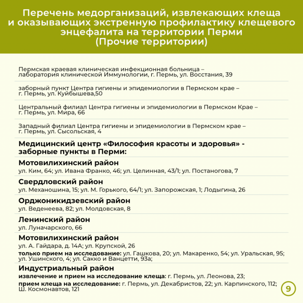 В минздраве Прикамья напомнили, что заражение клещевым вирусным энцефалитом может привести к поражению центральной нервной системы. Возбудитель болезни (арбовирус) передаётся человеку в первые минуты присасывания клеща, заражённого вирусом. Клещ может попасть на тело человека, гуляющего в лесах и парках, на дачном участке и других местах. Также клеща могут «занести» с прогулки домашние животные и т.д.