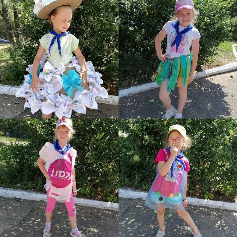 Воспитанники детсада и их родители выступили в роли дизайнеров, и их фантазии не было предела. Из каких материалов только не делали платья и сарафаны, костюмы и головные уборы. В ход шли пакеты для мусора, фасовочные пакеты, подарочная и гофрированная бумага, ленточки и бантики от подарков и многое другое, уже использованное и не нужное в доме.