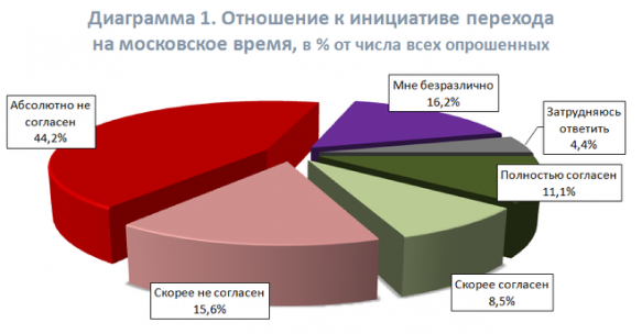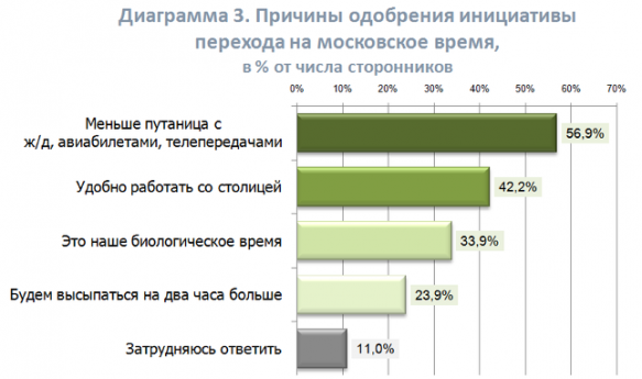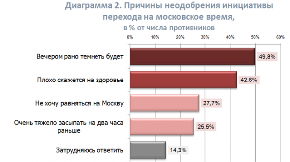 Около четверти респондентов, не согласных с переводом стрелок, объясняют это простым нежеланием ориентироваться на Москву (27,7%), а также возникновением сложностей с адаптацией — «тяжело засыпать на два часа раньше» (25,5%).