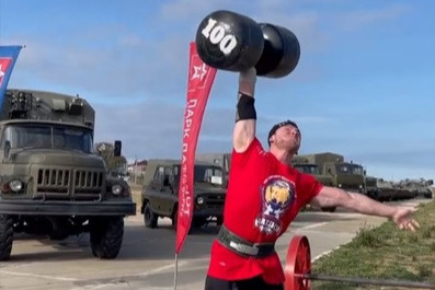 23-летний Борис Харламов четыре раза поднял одной рукой 100-килограммовую гантель.