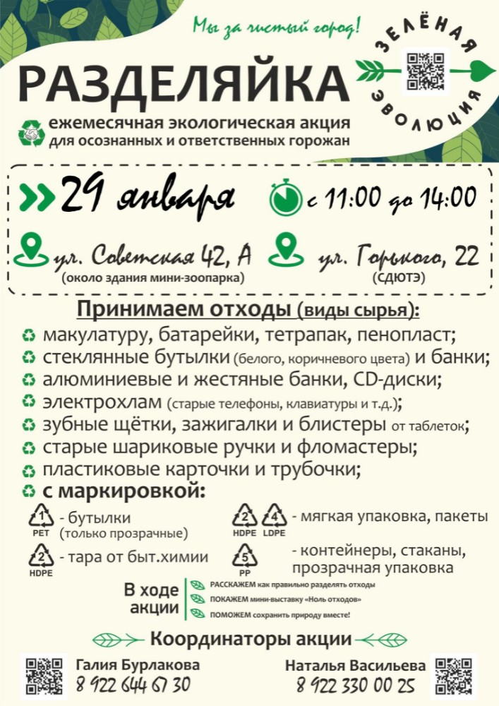 Организаторы акции - общественное движение «Зелёная эволюция» - приглашают на первую "РазделяйКу" в наступившем году и напоминают, что готовы принять вторсырьё, которое впоследствии будет отправлено на переработку.