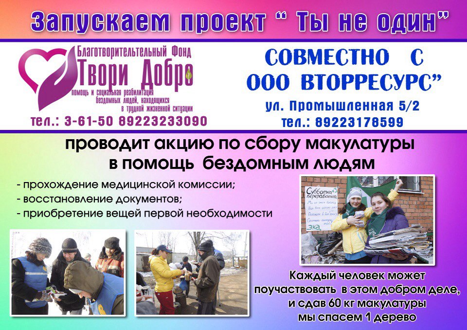 Суть акции «Ты не один» заключается в том, что все, кто не равнодушен к проблемам людей, оказавшихся в тяжелой ситуации, могут сдать макулатуру и даже получить за это деньги. Вся сданная макулатура будет переработана, а на вырученные средства, нуждающимся купят вещи первой необходимости и продукты питания, людям без определенного места жительства восстановят утраченные документы и помогут пройти медкомиссию.