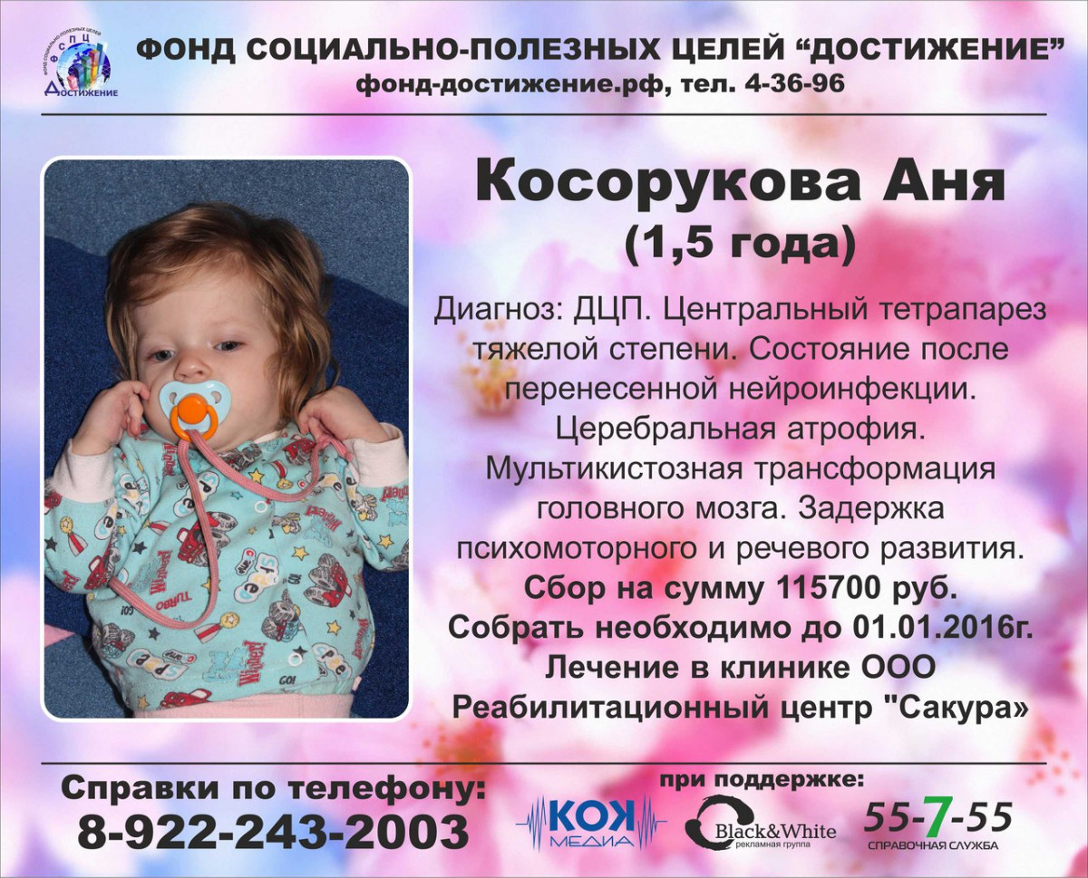 Фонд социально-полезных целей «Достижение» открыло сбор средств на лечение маленькой жительницы Чайковского – полуторогодовалой Ане Косоруковой. В конце марта после перенесенной болезни девочке установили инвалидность. Врачи поставили диагноз: ДЦП, центральный тетрапарез тяжёлой степени. Церебральная атрофия. Лейкомаляция головного мозга в стадии мультикистозной трансформации. Кроме того у малышки задержка психомоторного и речевого развития.