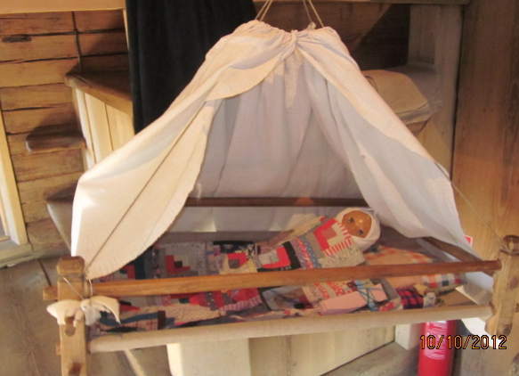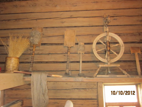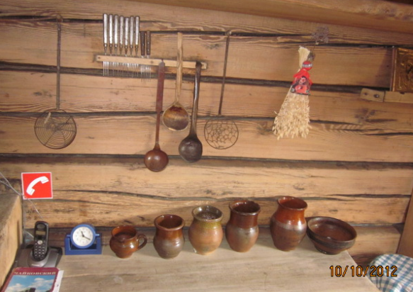 Экскурсовод рассказала маленьким посетителям о том, как жили крестьяне два века назад. Изба делилась на четыре угла: в печном углу, где стоит печь, не разрешалось громко разговаривать, ругаться и спорить, в «красном» углу расположена божница с иконами и стол. «Середа» – место «большухи» - хозяйки дома, которая занималась приготовлением пищи, здесь же «зыбка» - люлька для грудничков, а также – полка «грядка», на ней выставлена вся самая красивая посуда и полотенца, изготовленные женщинами вручную. Последний угол – дверной, над дверью – «полати», где на досках спали дети. Помещение делилось на две части: тёмная – мужская, светлая – женская. «Первая» лавка предназначалась для женщин, средняя делилась на светлую половину и тёмную, самая узкая лавка у входа – для гостей.