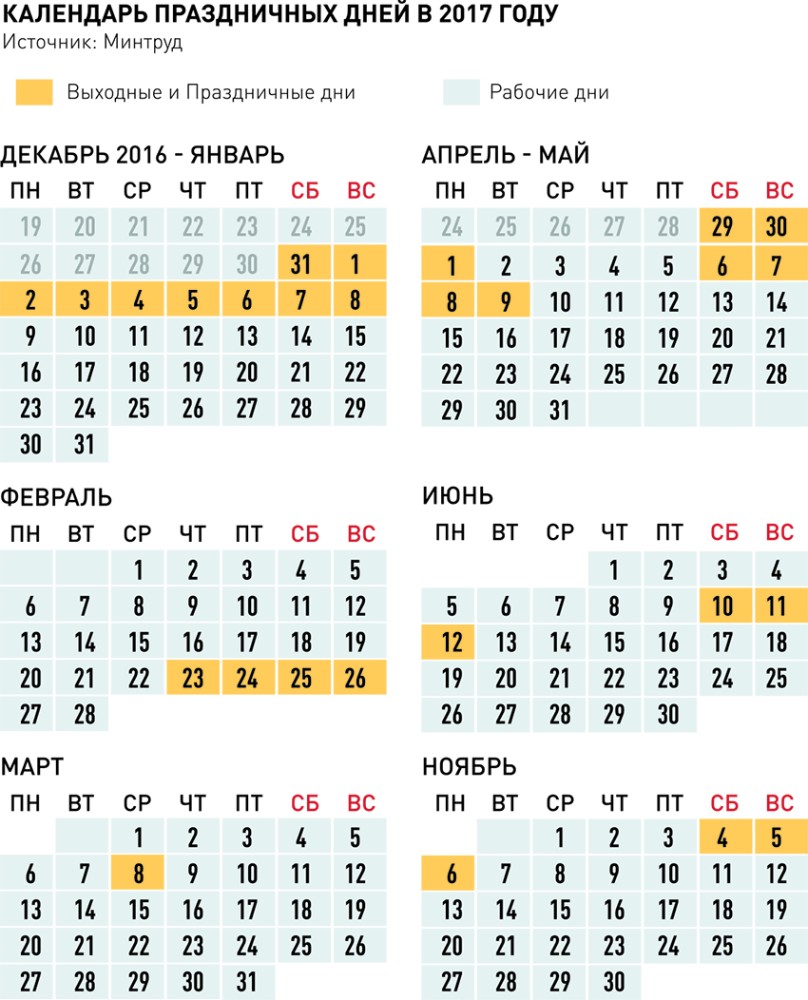 Глава Правительства РФ Дмитрий Медведев подписал специальное постановление, в котором был определён график отдыха россиян в связи с государственными праздниками. «В целях рационального использования работниками выходных и нерабочих праздничных дней Правительство Российской Федерации постановляет перенести в 2017 году следующие выходные дни: с воскресенья 1 января на пятницу 24 февраля и с субботы 7 января на понедельник 8 мая», - говорится в тексте документа.