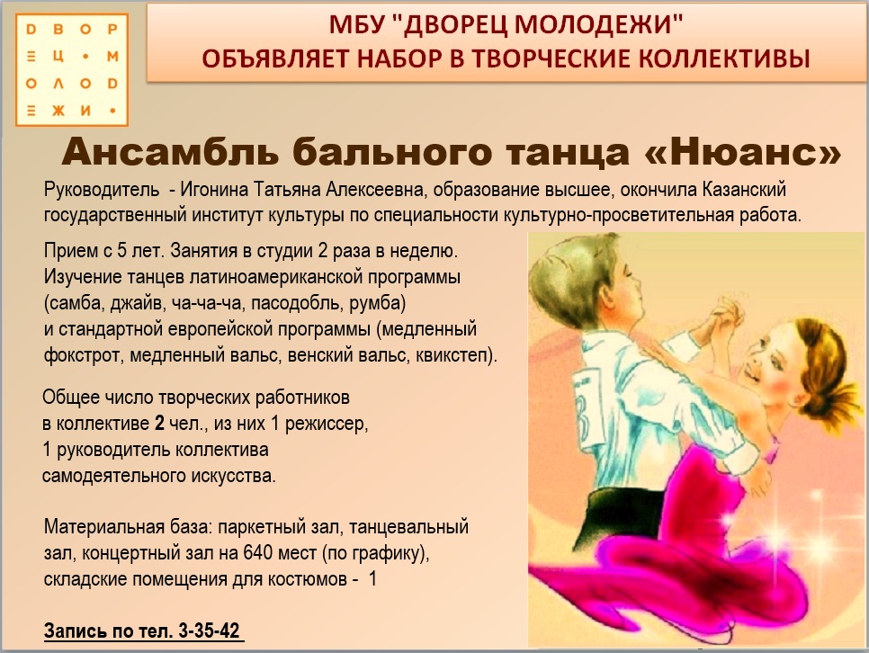 В творческие коллективы Дворца молодёжи идёт набор детей. Так, юные чайковцы, которым исполнилось пять лет, могут записаться на занятия в ансамбль бального танца «Нюанс». Руководитель ансамбля - Татьяна Алексеевна Игонина. Будущим танцорам предстоит изучение танцев латиноамериканской программы (самба, джайв, ча-ча-ча, пасодобль, румба) и стандартной европейской программы (медленный фокстрот, медленный вальс, венский вальс, квикстеп).