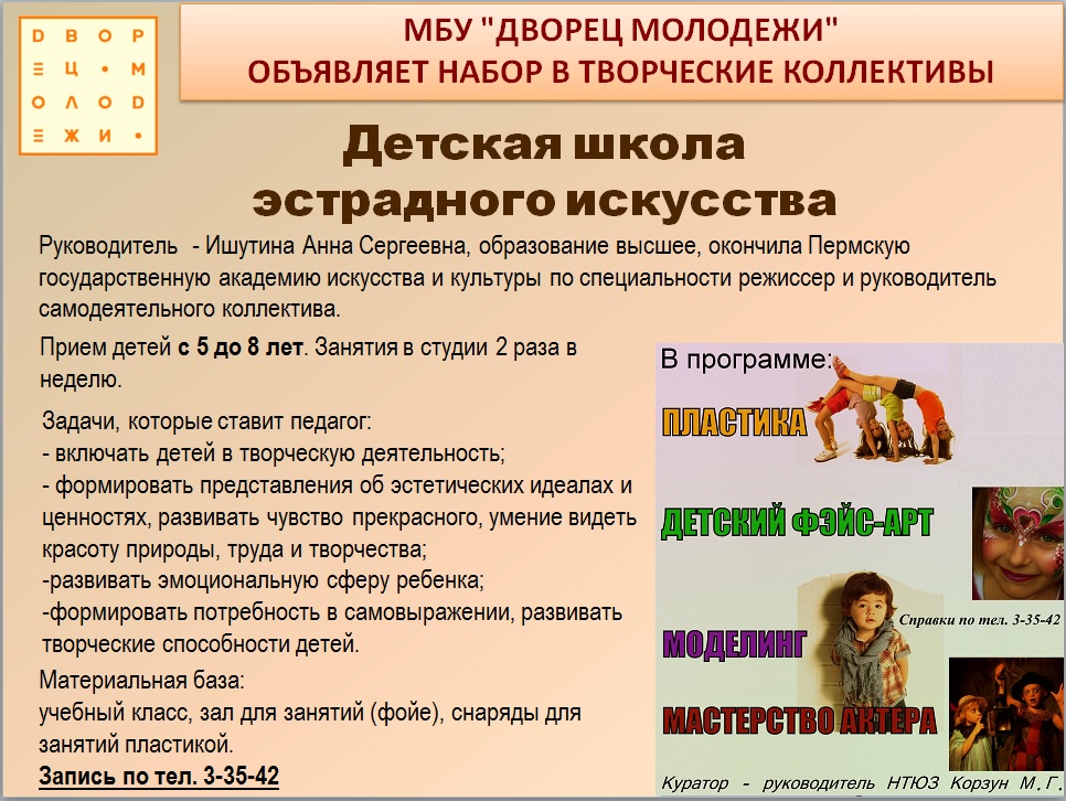 Маленьких жителей Чайковского, с 5 до 8 лет, ждут также в детской школе эстрадного искусства. Руководитель - Анна Сергеевна Ишутина. Задачи, которые ставит педагог: включение детей в творческую деятельность; формирование представления об эстетических идеалах и ценностях, развитие чувство прекрасного и творческих способностей у детей.