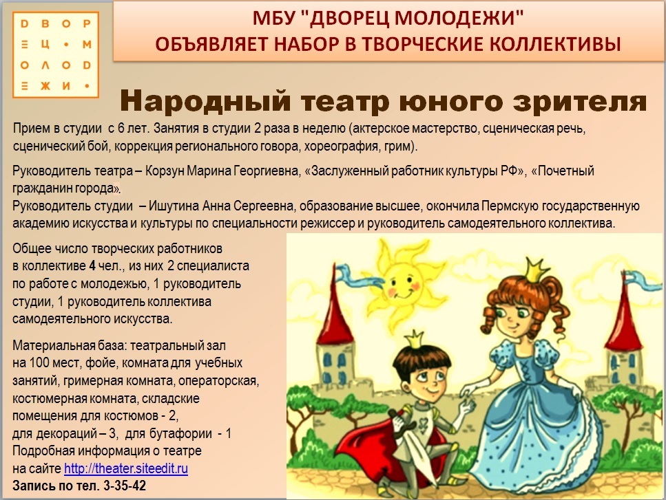 Кроме того, в Народный театр юного зрителя также набираются дети с шести лет. Ребята изучат актёрское мастерство, сценическую речь, сценический бой, хореографию. Руководитель театра – Марина Георгиевна Корзун. Стоит отметить, что НТЮЗ – один из старейших творческих коллективов, этой осенью ему исполнится 40 лет.